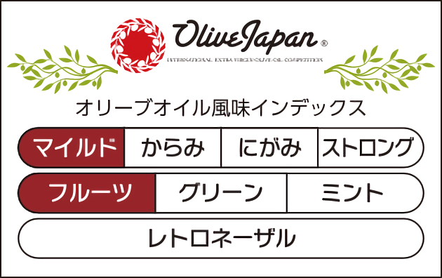 完熟トロピカルフルーツの甘酸っぱいアロマ。熟したオリーブ果実の香り、すっきりとした甘さに控えめな苦みと辛さ。後味はスパイシー。