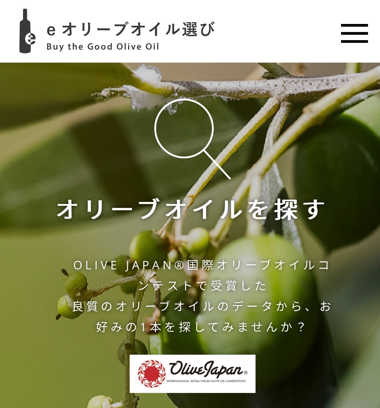 「eオリーブオイル選び」は、いつでも世界中の高品質オリーブオイルと、オリーブオイルにまつわる信頼できる情報に出会え、いいオリーブオイルにつながるサイトです。 このサイトは、オリーブオイルに関する基本知識や楽しみ方、レシピを紹介するだけでなく、世界TOP10の主要コンテストの一つに選ばれている「OLIVE JAPAN® 国際オリーブオイルコンテスト」の受賞商品が検索でき、その商品がどこで買えるかを簡単にご覧いただけます。(スマホ・PC対応) サイト利I用は無料です。