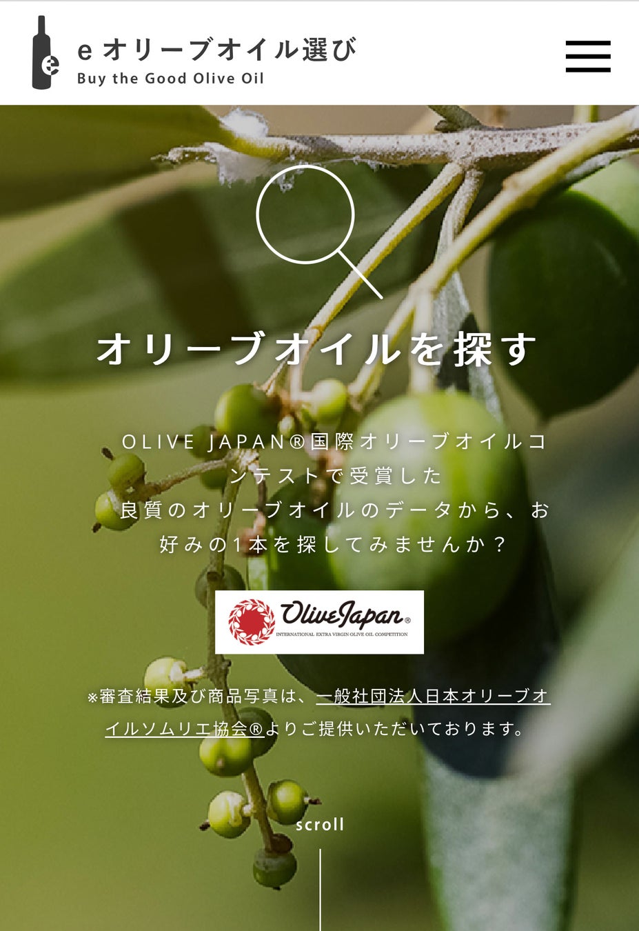 「eオリーブオイル選び」は、世界各国の高品質オリーブオイルと、オリーブオイルに関するさまざまな情報に出会えるサイトです。 オリーブオイルの基本知識やレシピを紹介するだけでなく、世界TOP10の主要コンテストの一つに選ばれている「OLIVE JAPAN®国際オリーブオイルコンテスト」の受賞商品が検索できその商品がどこで買えるかを簡単にご覧いただけます。また、一部商品は「eオリーブオイル選びお届けサービス」でご購入いただけます。